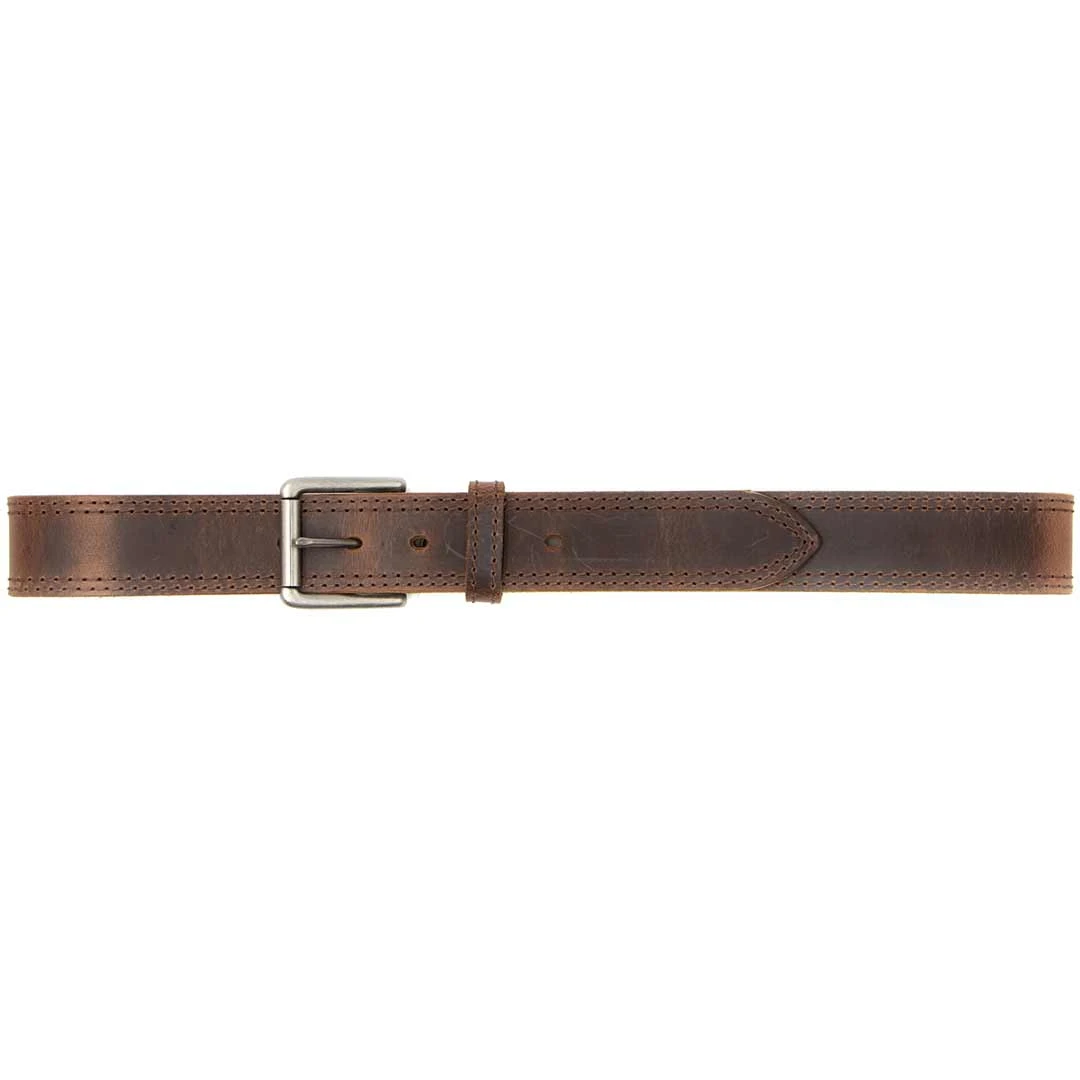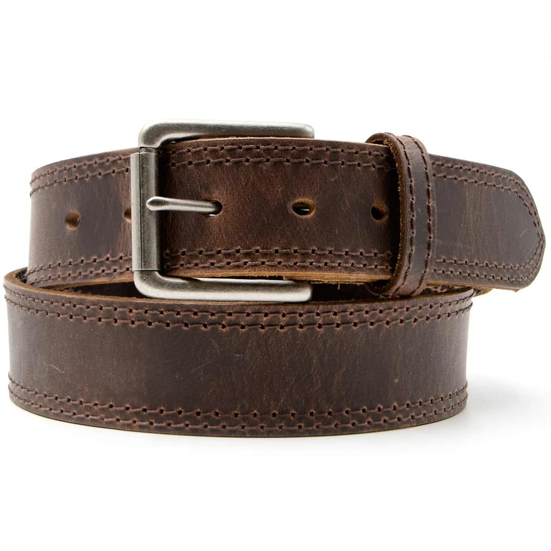 From And West, this belt set features an antique silver buckle, double stitching and snaps that allow you to change out the buckle with a distressed brown strap.