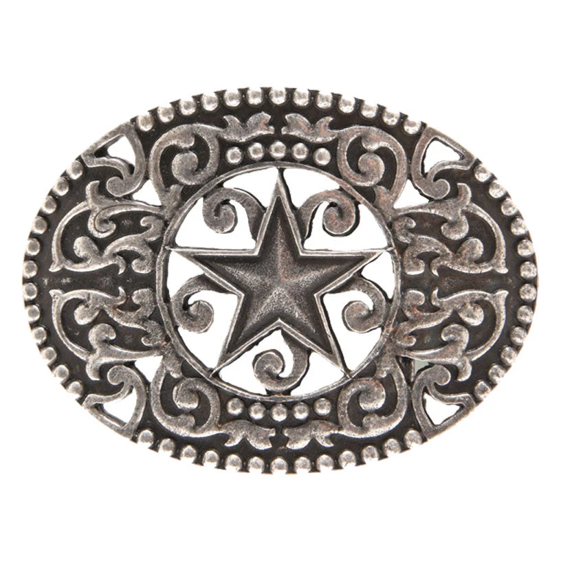 From AndWest, this star and scroll filigree belt buckle is done in antique silver.