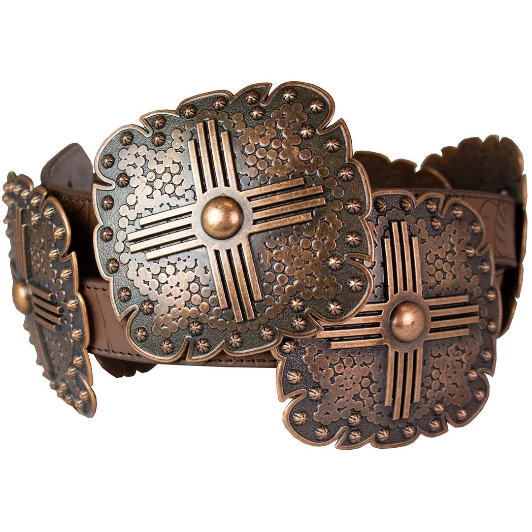 From Angel Ranch this leather belt features a floral embossed strap, large square antique copper Conchos with a removable antique copper tone buckle.