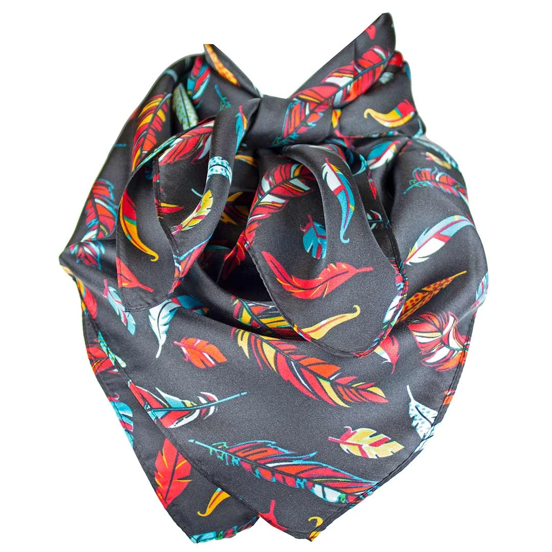 This beautiful multi-coloured feather print wild rag is more than a western fashion accessory. Made from 100% silk, this square scarf will keep you warm in cold weather and cool in warm weather. With fashion and function, you can’t go wrong!