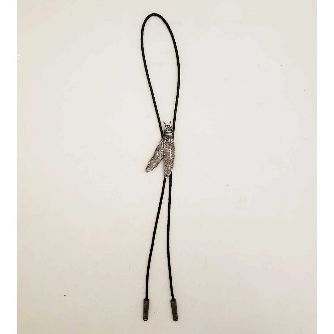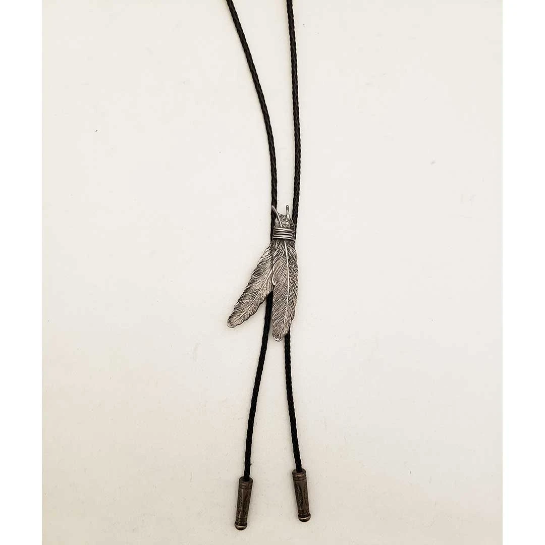 From Austin Accent this bolo tie features pewter feathers with black rope and heavy duty tips.