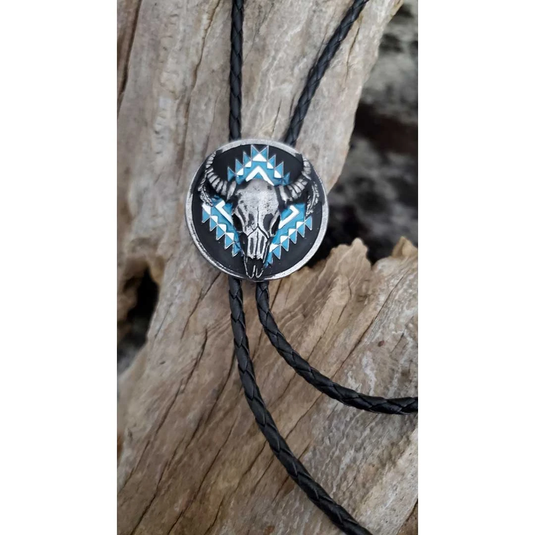 When it’s time to dress up, you can’t go wrong with a classic western look. This dressy bolo tie is made of braided leather with metal tips and has a circular slide with a steer skull on a turquoise and white Aztec background.