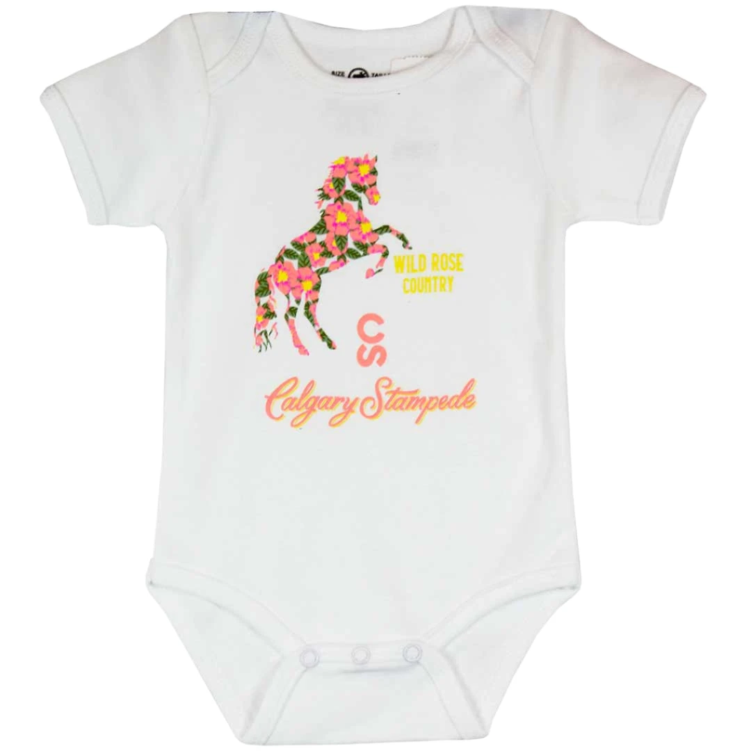 Custom made for the Calgary Stampede, this baby girls’ onesie features short sleeves, crew neck with extra room, 3 snaps at seat and a Calgary Stampede circle wild rose country graphic.