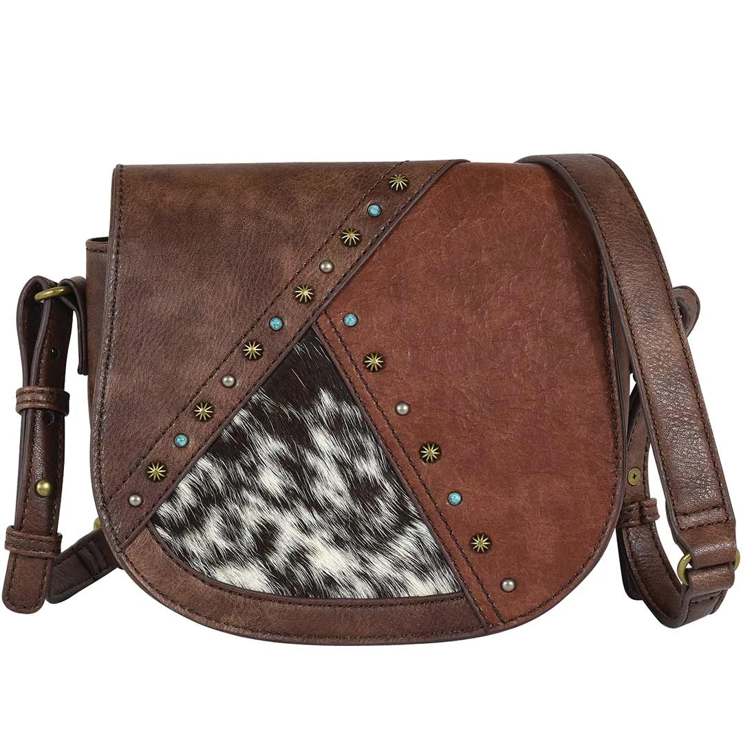From Catchfly, this women’s crossbody bag is done in two tone brown and features a hair on hide accent. It has one compartment, one zip pocket, one organizational pocket, 6 card slots and magnetic snap flap closure.