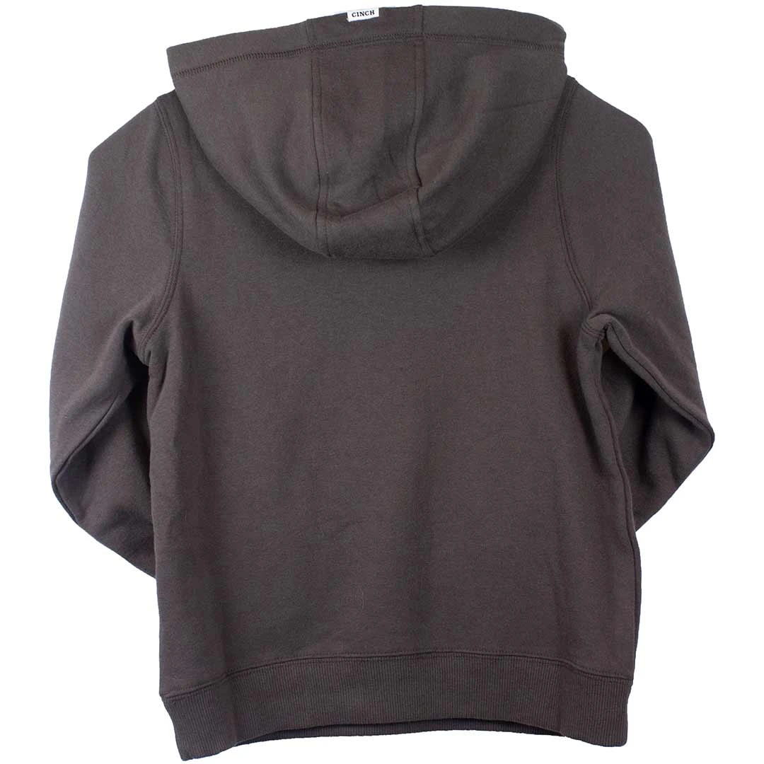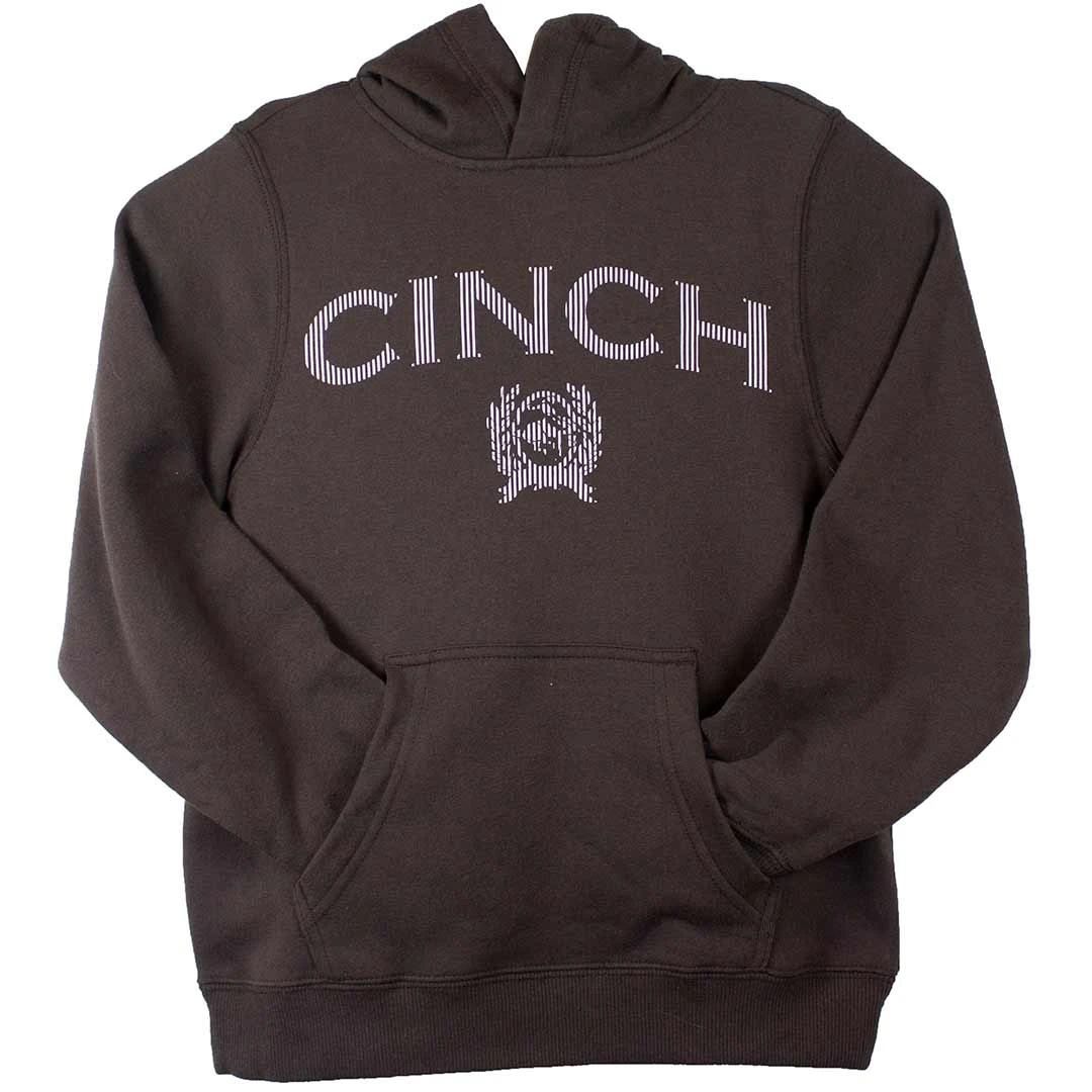 Add outerwear style to his school day or for any weekend adventure with this dark brown popover hoodie. This cool weather must-have features a lined hood, front kangaroo pocket and CINCH logo screenprint.