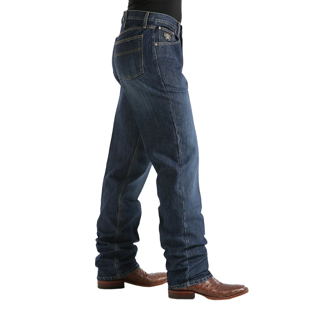 This relaxed Cinch jean has a lower rise fit. The relaxed waist and hip work together to provide the perfect combination of fit and comfort. The relaxed, sandblasted thigh blends into the slightly tapered bottom opening creating a truly genuine western jean.