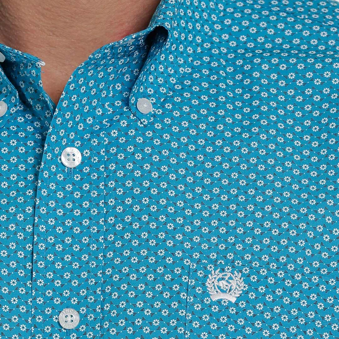 Keep your look uniquely you wearing a CINCH brand blue cotton plain weave button down featuring an all-over white daisy print. Design details include an open left front pocket with embroidered logo and white buttons.