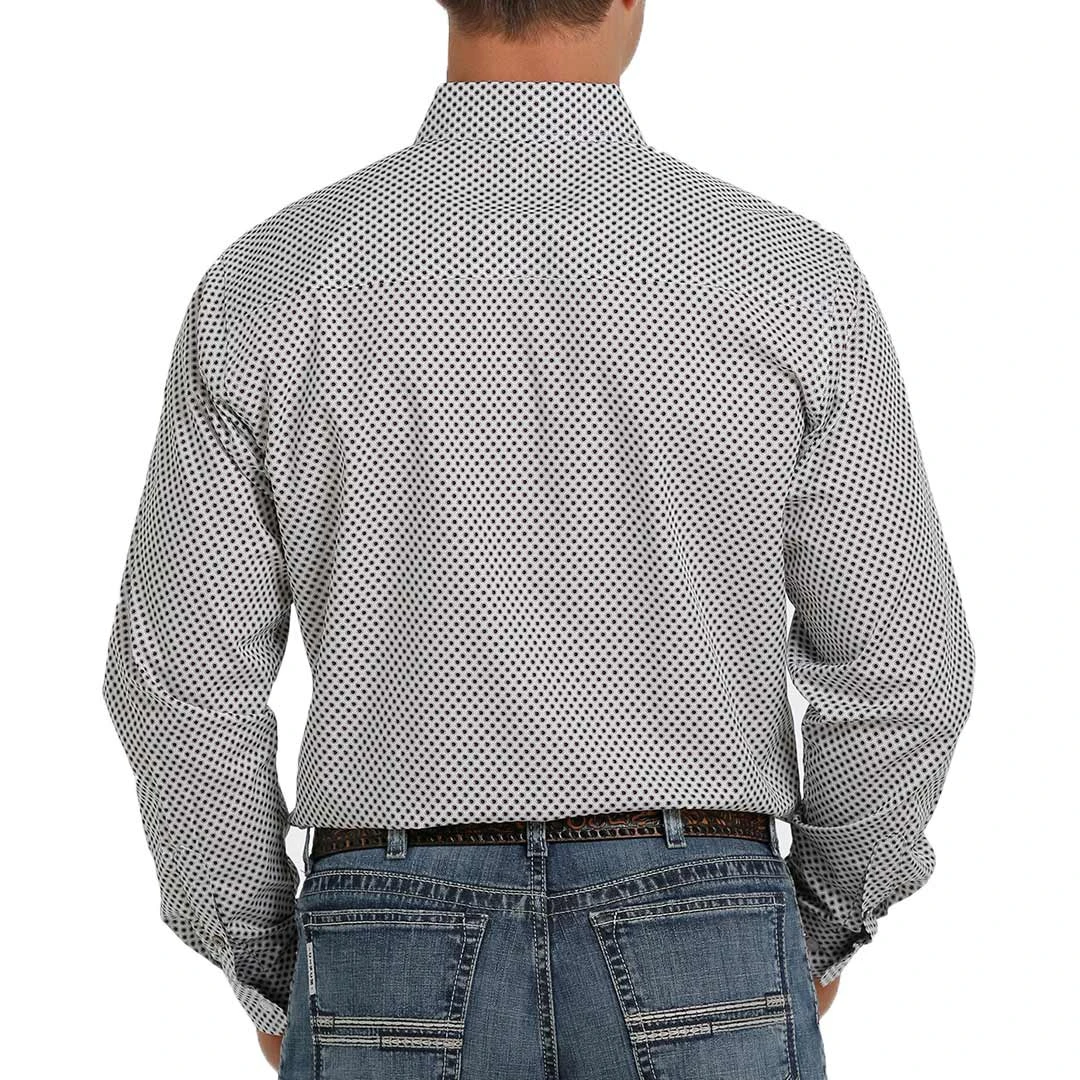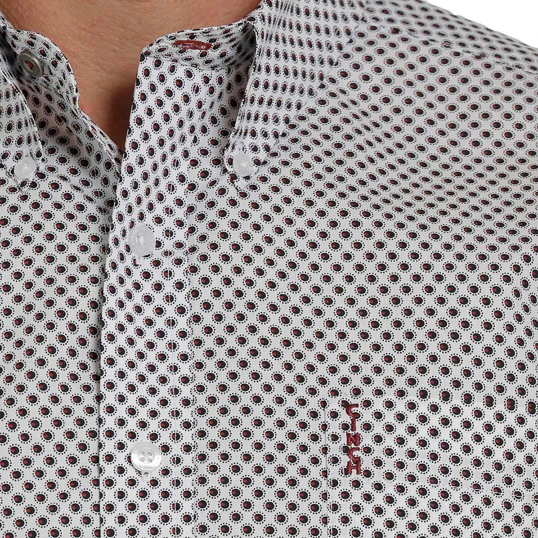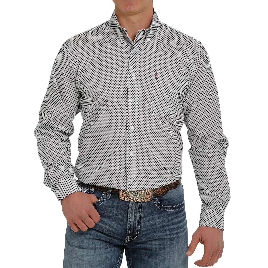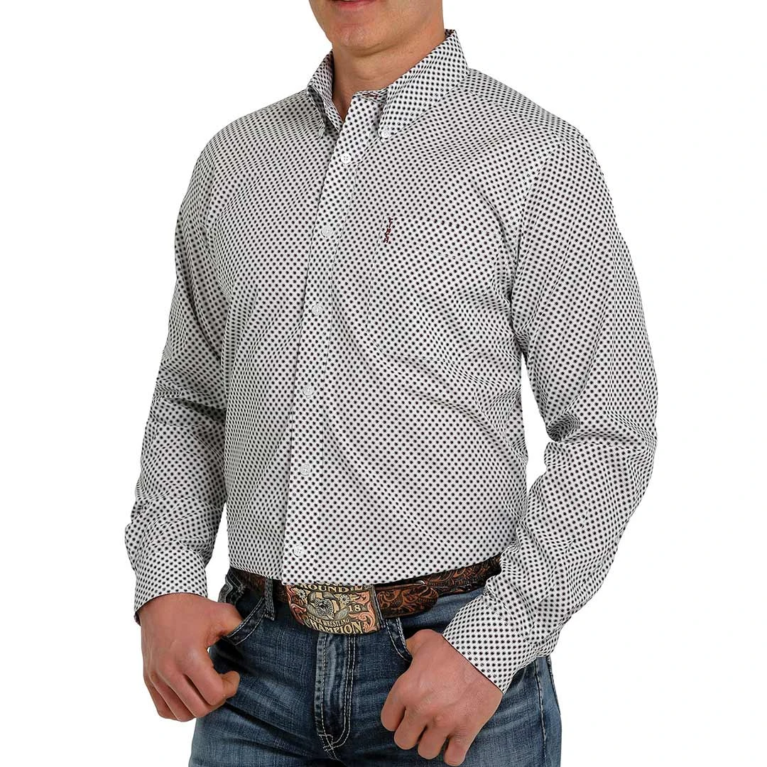 Master any business-casual dress code wearing a white geometric printed cotton plain weave engineered by CINCH. This handsome Modern Fit shirt features white buttons and an open left front pocket with embroidered logo.