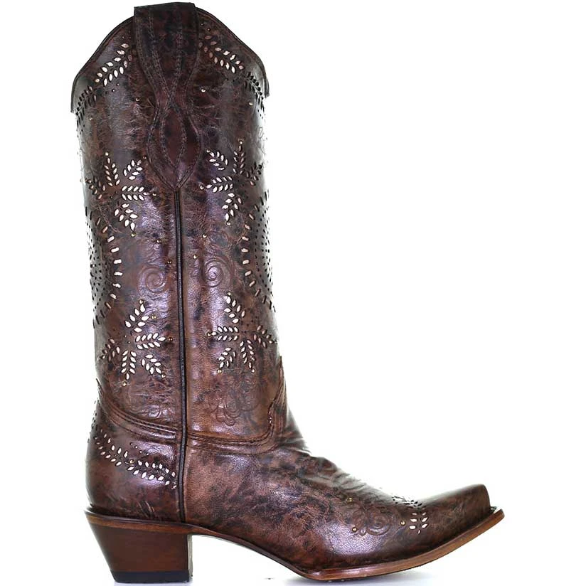 Style meets comfort with this striking pair of cowgirl boots from Circle G by Corral Boot Co. They feature a Fango brown leather foot and upper, laser cut-out design, snip toe and fashion heel.