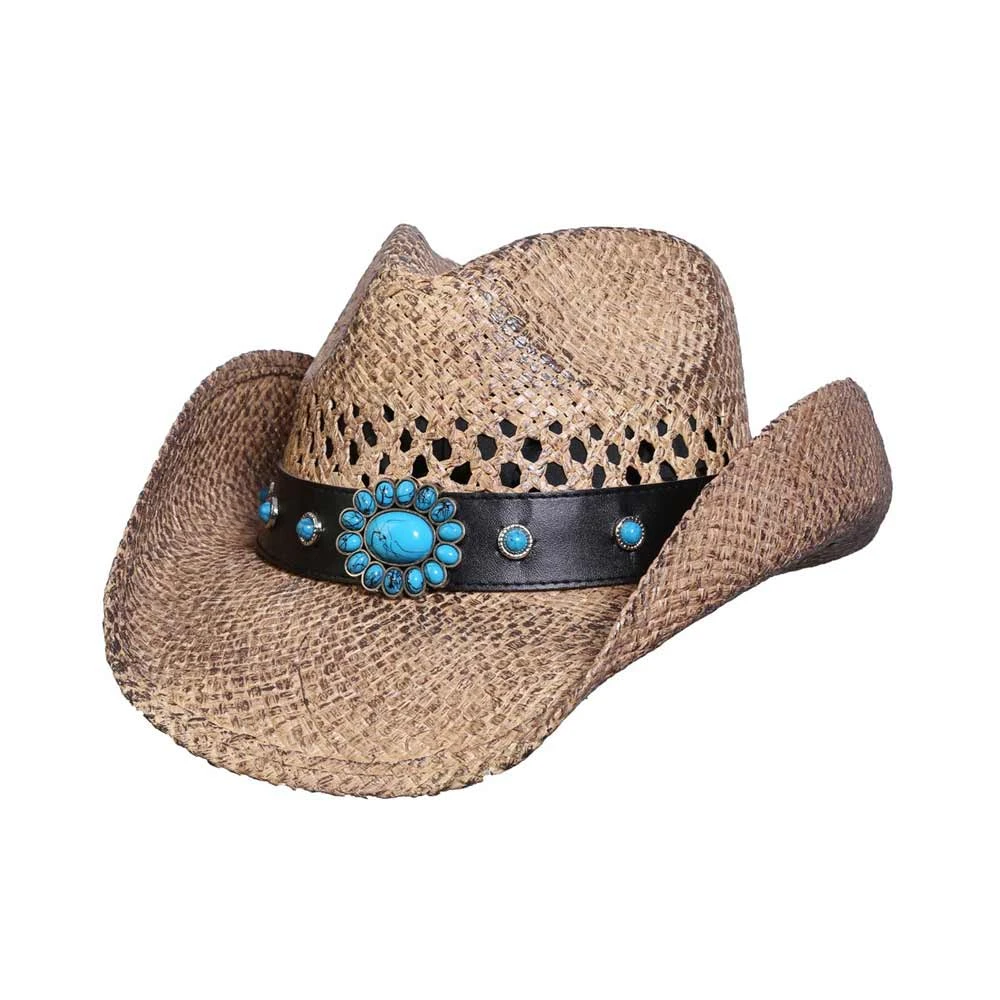 This hat from Conner Hats features turquoise Conchos and a leather band, a shapeable brim and a deluxe inner terry stretch band for a comfortable fit.