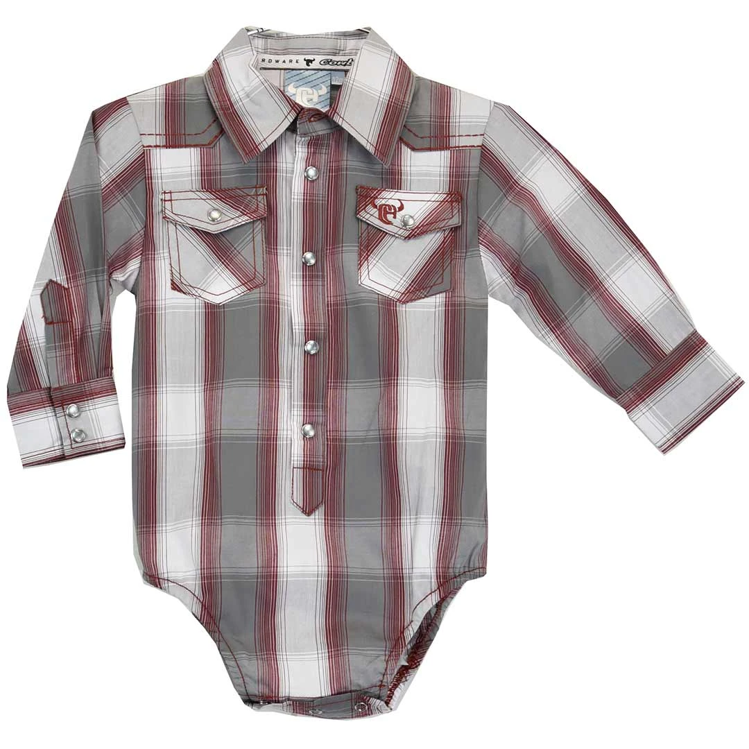 It’s never too young to start them in classic plaid! From Cowboy Hardware, this boy’s onesie features both the front and back yokes outlined in contrast stitching with the matching CH logo embroidered on the front left chest pocket and snaps for easy changes.