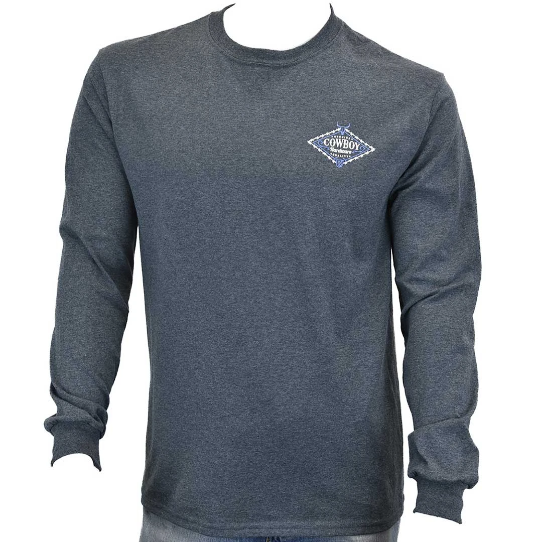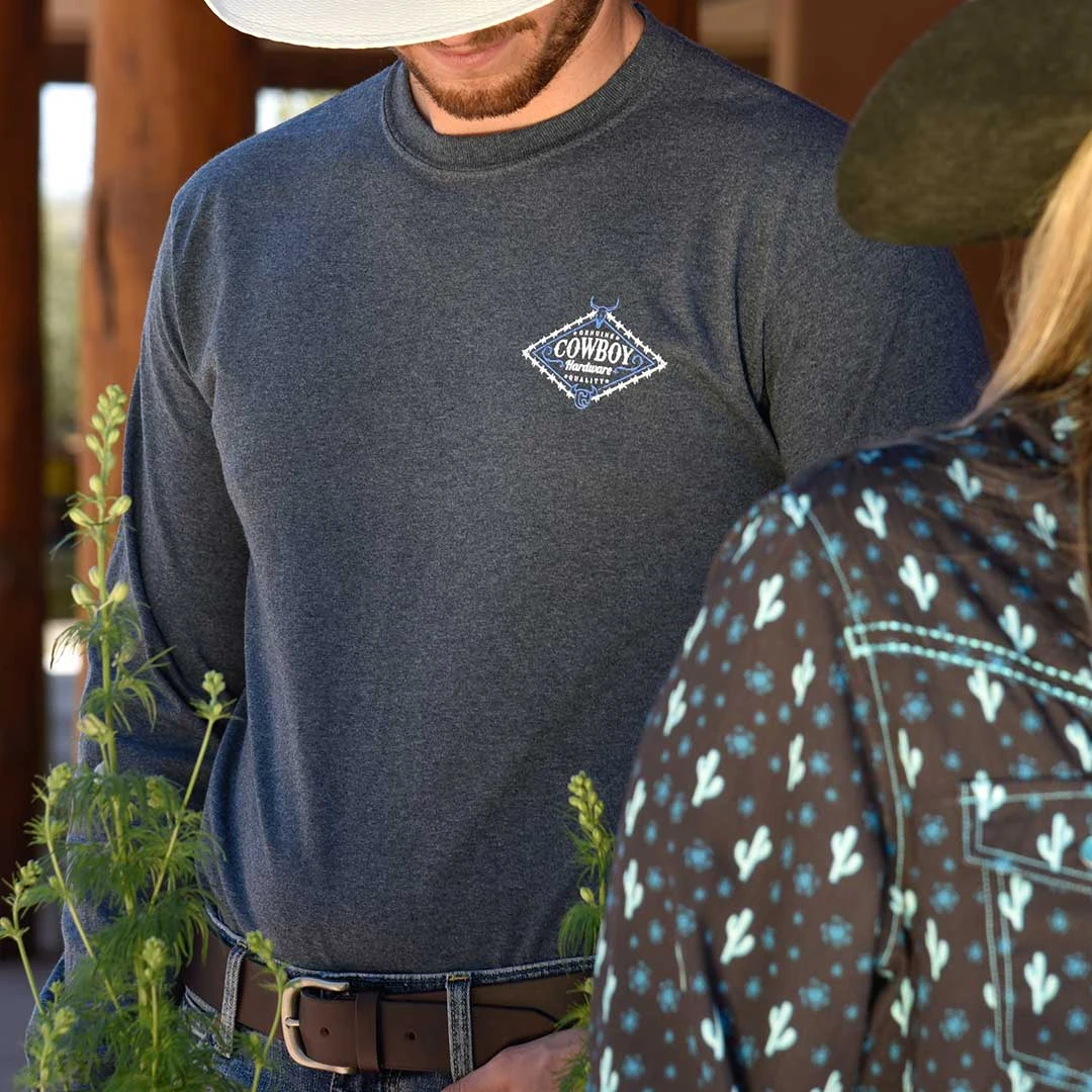 As weather gets colder it’s time to change the standard tee to one with long sleeves. From Cowboy Hardware, this men’s long sleeve heather tee features a Cowboy Hardware logo graphic print on the back.