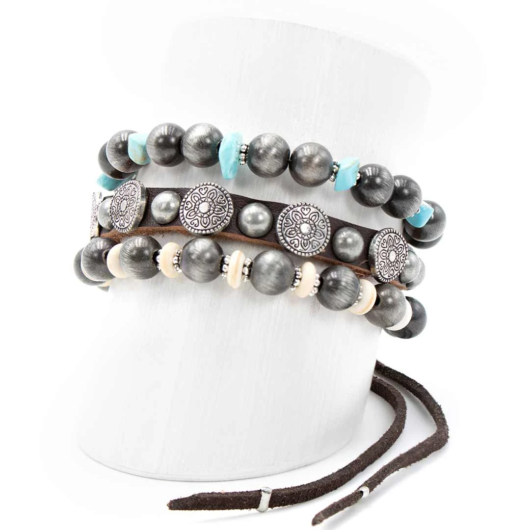 This Cowgirl Confetti brown triple layered leather cuff features turquoise embellishments, small round etched beads, and white howlite with an adjustable tie closure.