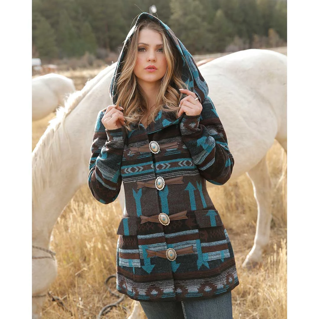 Changing seasons means it’s time for the inviting colors and cozy texture of a patterned tweed coat like this one crafted by Cruel Denim. Built with easy entry front pockets and an oversized hood for added coverage, Southwest styling includes faux leather detail and Concho toggles.