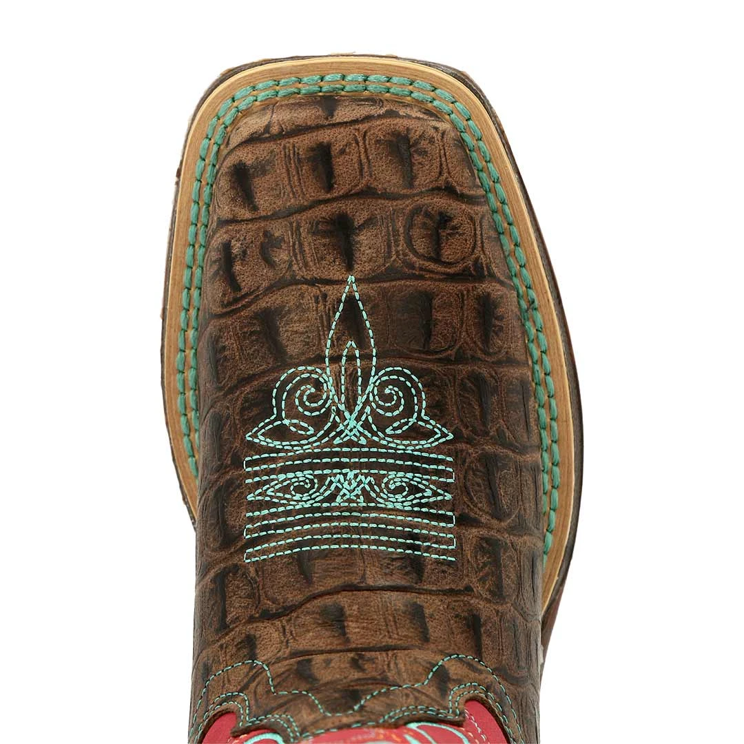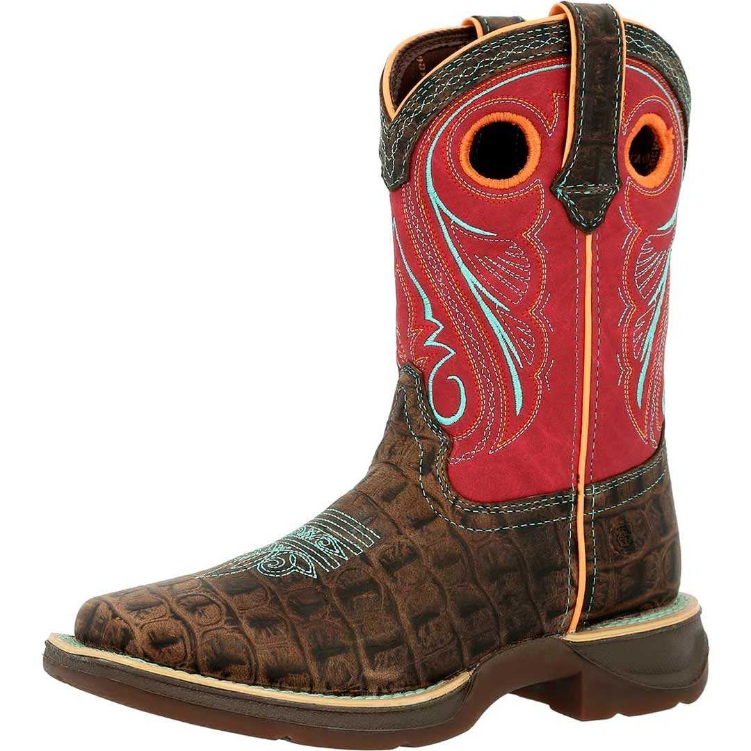 Your kids are going love this 8″ Western Gator Emboss/Electric Red Lil’ Rebel by Durango. This style has a full-grain leather foot, collar and pull straps with a faux shaft. Inside it has a soft mesh lining, cushion flex insole, rolled shank area and fiberglass shank. The outsole is rubber and it has a double row sole stitch around the square toe and a 1″ heel.