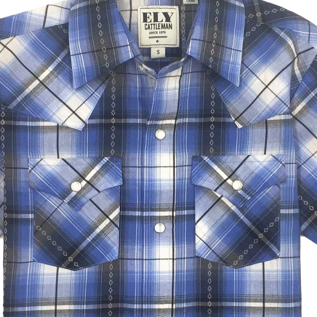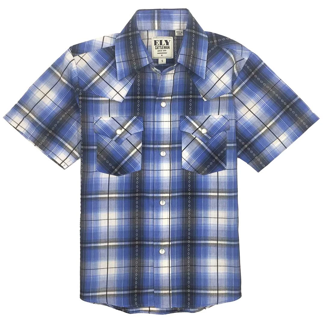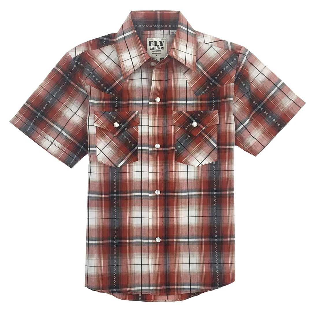 From Ely Cattleman, this boy’s short sleeve shirt features diamond dobby accented plaid and pearlized western snaps. Perfect for school and family photos!