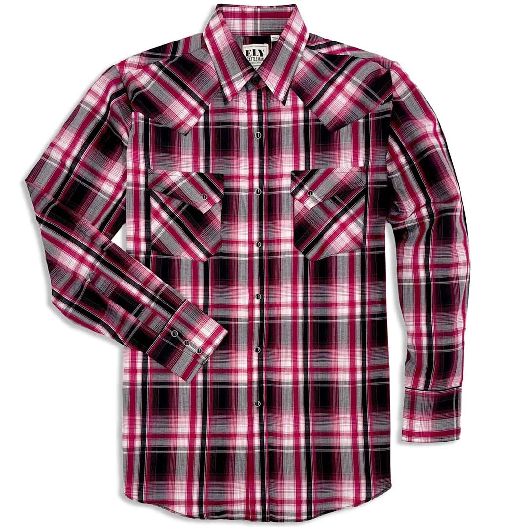 The classic! This rich looking plaid shirt from Ely Cattleman features black western snaps, front and back western yokes and two front offset flap pockets with snaps.