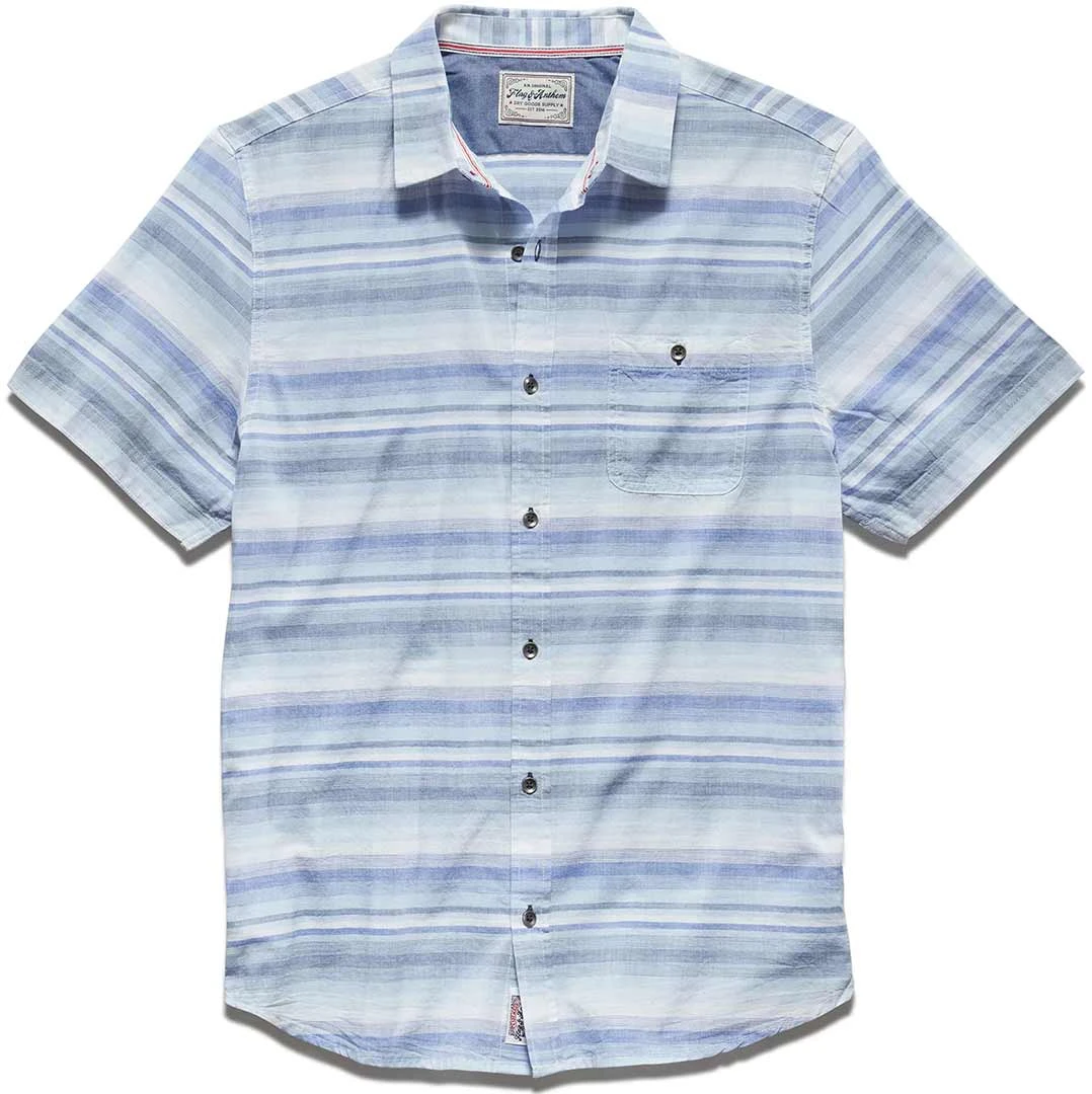 Flag & Anthem’s Centerton Striped Shirt is a great choice for warm weather. Made from lightweight and breathable premium cotton, impeccably tailored in the perfect untucked length, this classic short sleeve button-up can be dressed up or down for any occasion. Contrast fabric inside collar stand, back yoke, front placket, and sleeve cuffs. Single front chest pocket; button closures. Tailored athletic fit.