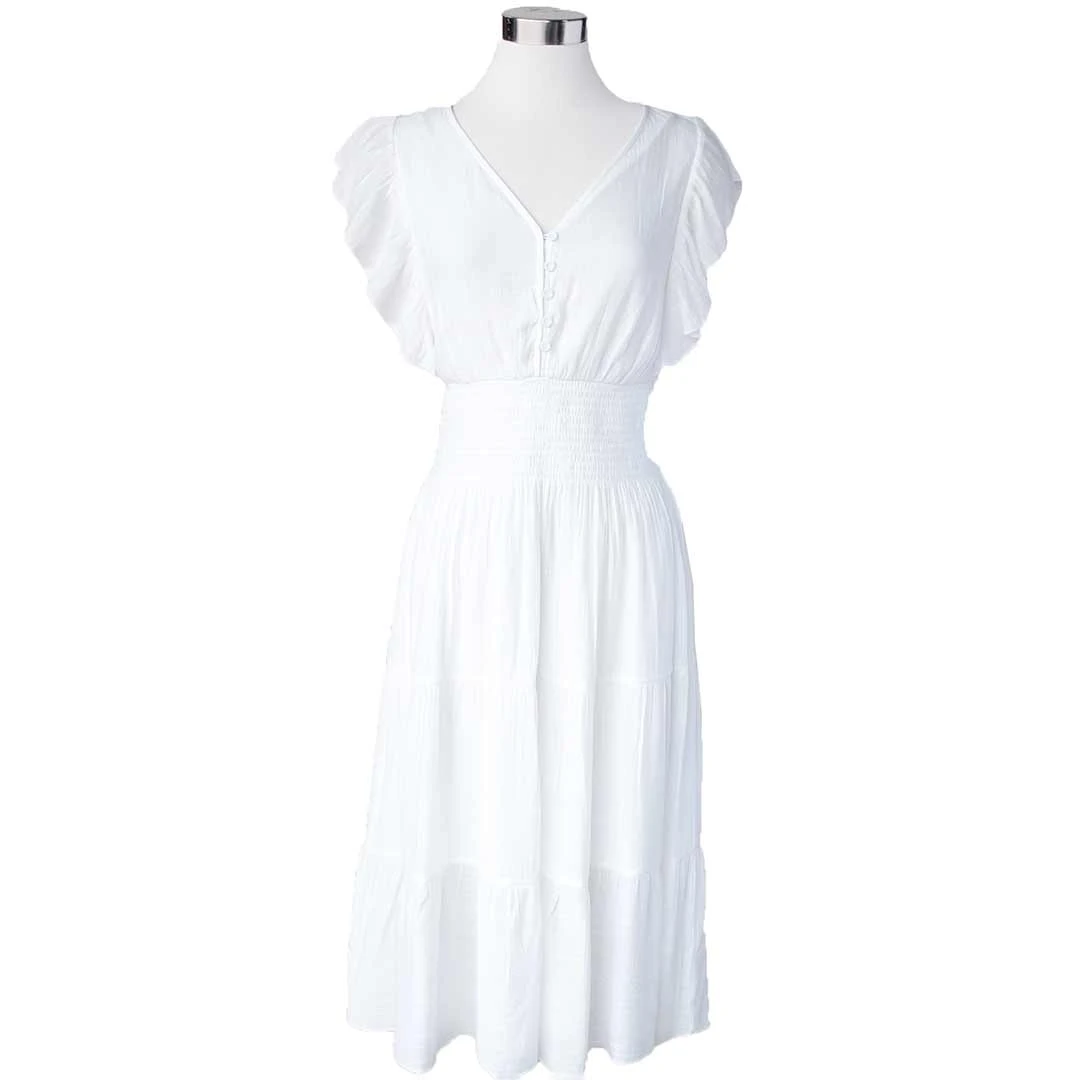 Summer here we come! From Keren Hart, this women’s dress is just what you need to welcome the warm weather. The dress is constructed with three parts, a flutter sleeve bodice with a V-neck and button accents, a wide smocked waist band and a tiered skirt. Pair with cute sandals or your favourite cowboy boots, this dress is a must have this season.
