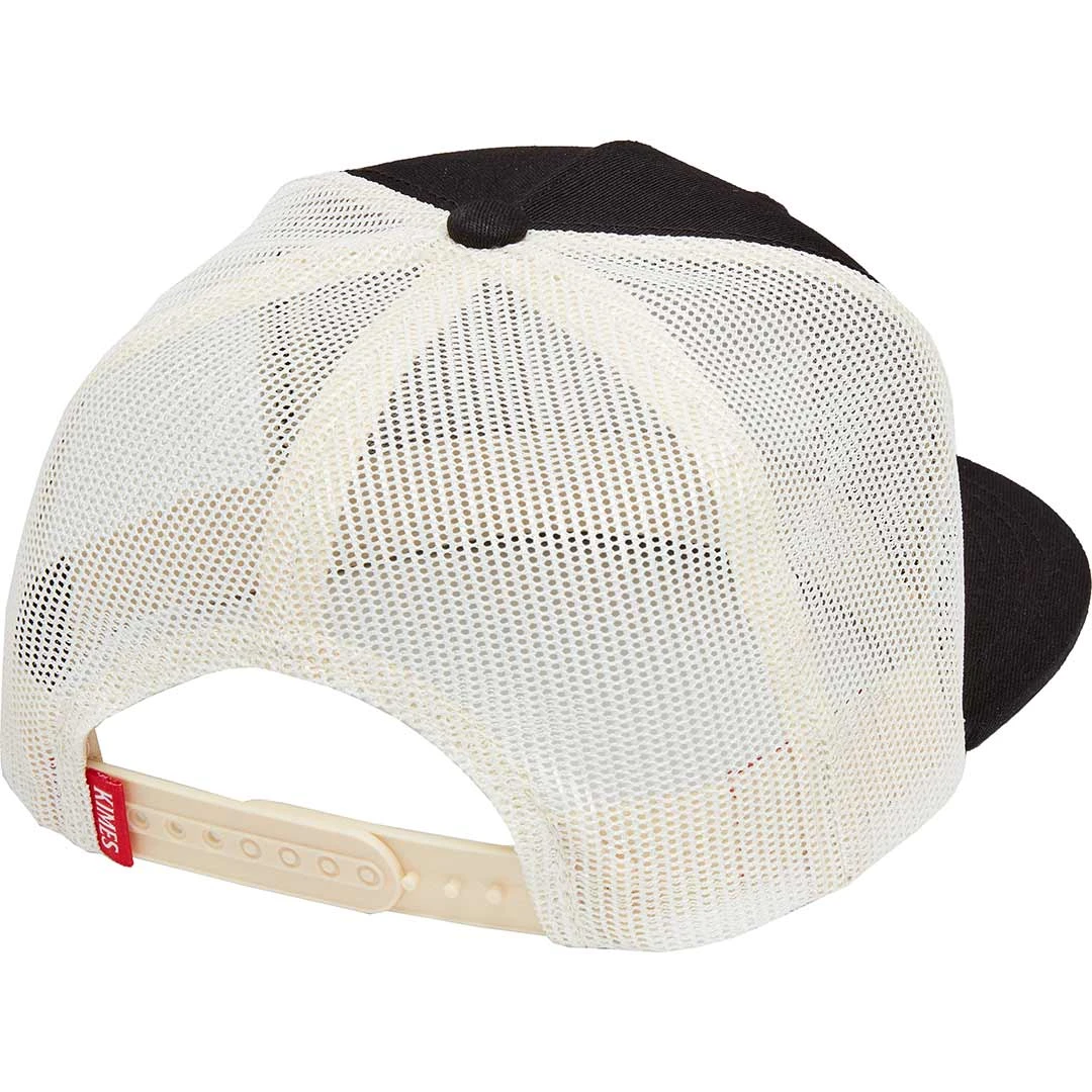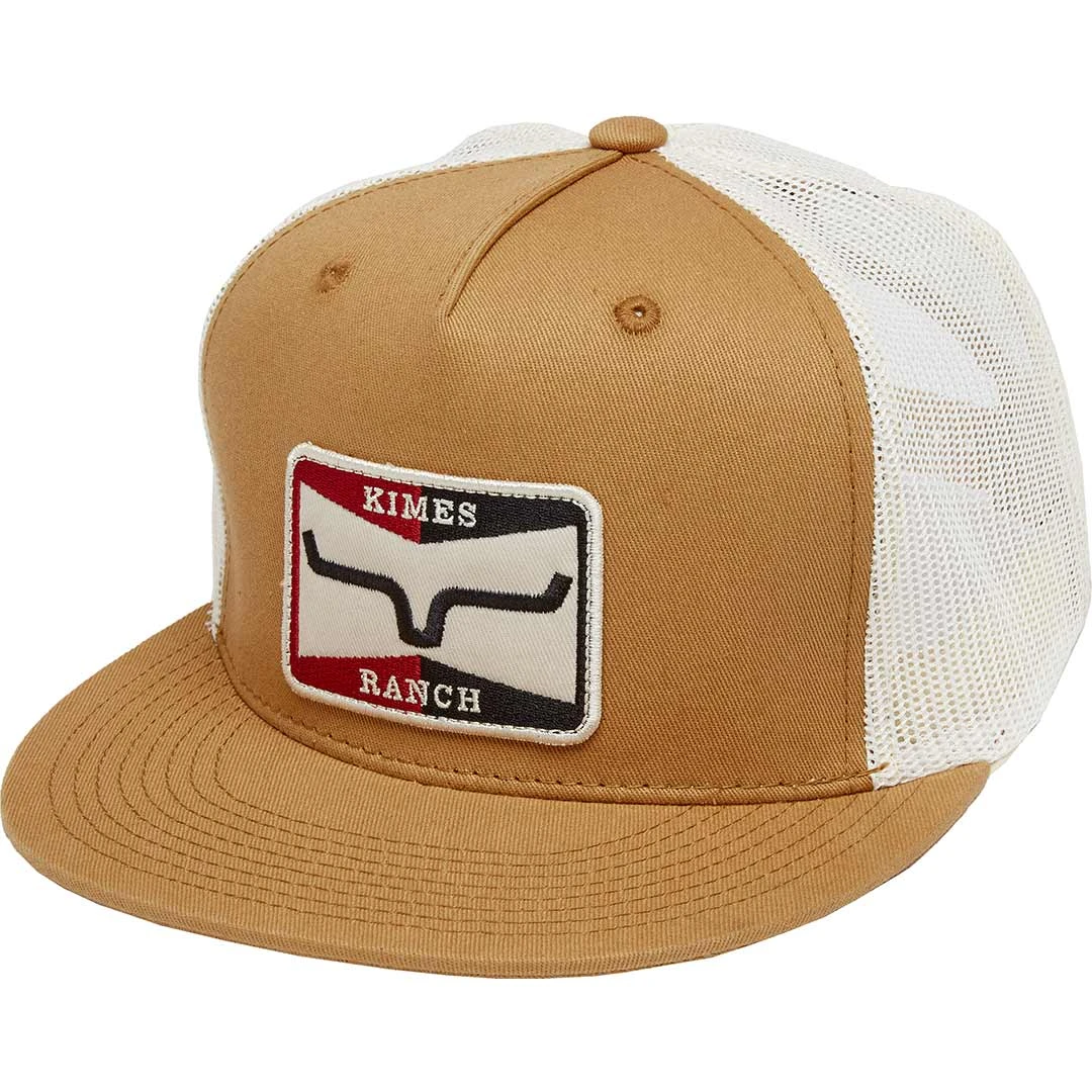 The Sparky trucker cap from Kimes Ranch features 5 panel construction, a mesh back, snap back closure, embroidered red, black and white horns twill patch on the front and a flat bill.