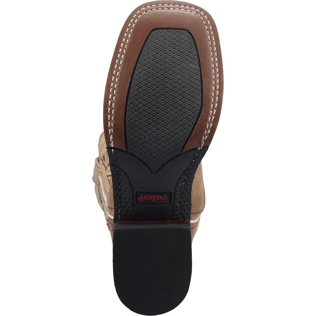 This women’s boot from Laredo features a symmetrical design on the shaft, square toe, stockman heel, leather foot and a removable cushion orthotic insole.