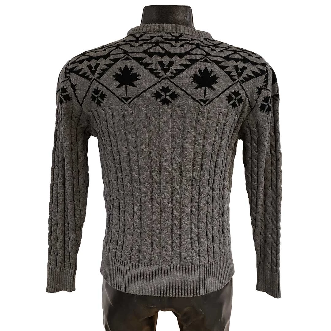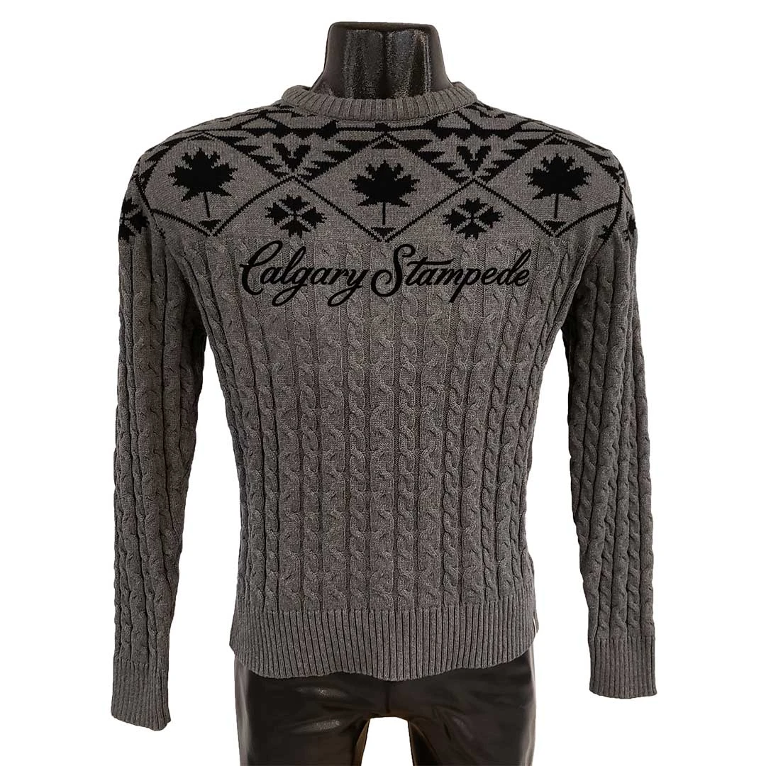 This classic cable knit sweater features a maple leaf pattern at the top and Calgary Stampede applique.
