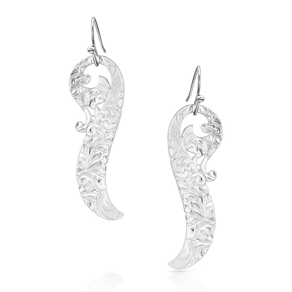 The Connected Feathered Filigree Earrings from Montana Silversmiths display western glamour. From the French hook, a pendant-style single feather contours around itself. It flares to the bottom and holds a vertical line of silver-finished studs surrounded by hand-painted black for contrast. Inspired by nature and symbolic of hope in flight.