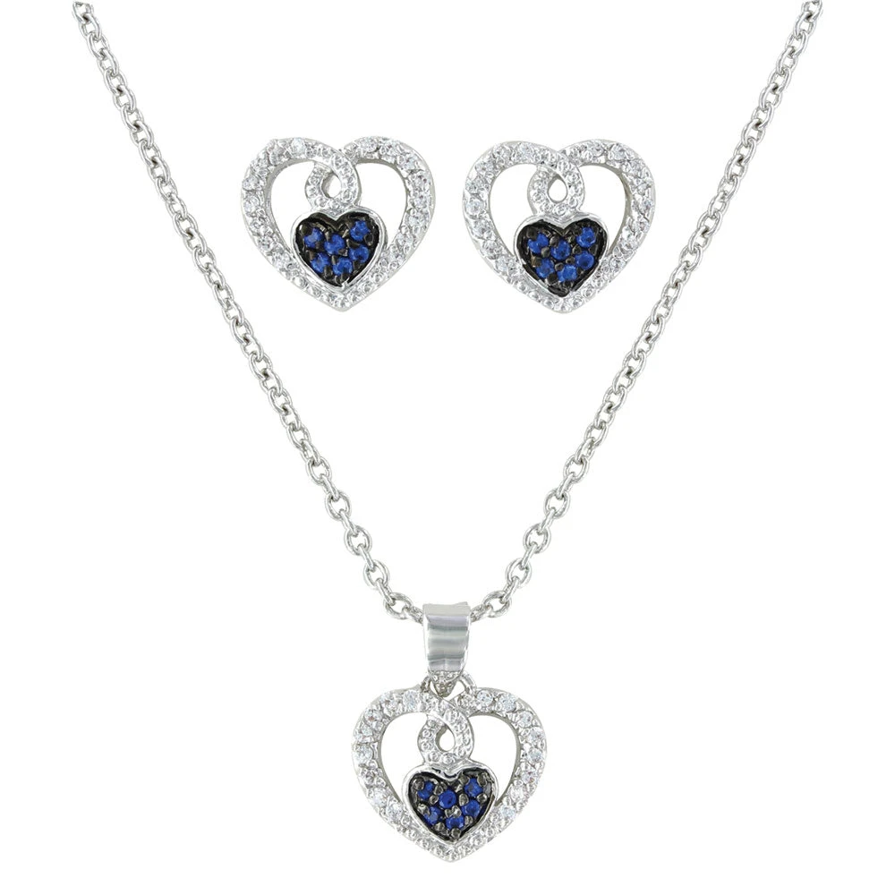 A whimsically delicate jewelry set from Montana Silversmiths features deep blue rhinestones that form a petite heart resting at the base of a larger curlicue clear rhinestone open heart. Earrings have a hypoallergenic stainless steel post. Necklace is a 19 inch princess length chain.