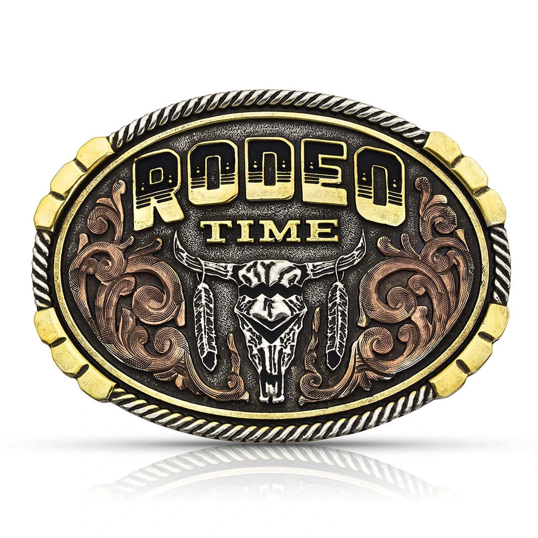 It’s always Rodeo Time! This tri-colored oval cast Montana Silversmith Attitude buckle is an officially licensed Dale Brisby product. With “Rodeo Time” spelled out along the top in a faded gold tone with an antiqued silver tone steer skull with dangling feathers in the center underneath the words. Rose gold toned filigree fills the rest of the space along the sides. A thin gold toned wire surrounds the center design with an antiqued silver tone rope design with four sets of three smooth beads at each “corner”. Belt buckle has a 1.5 inch belt swivel.