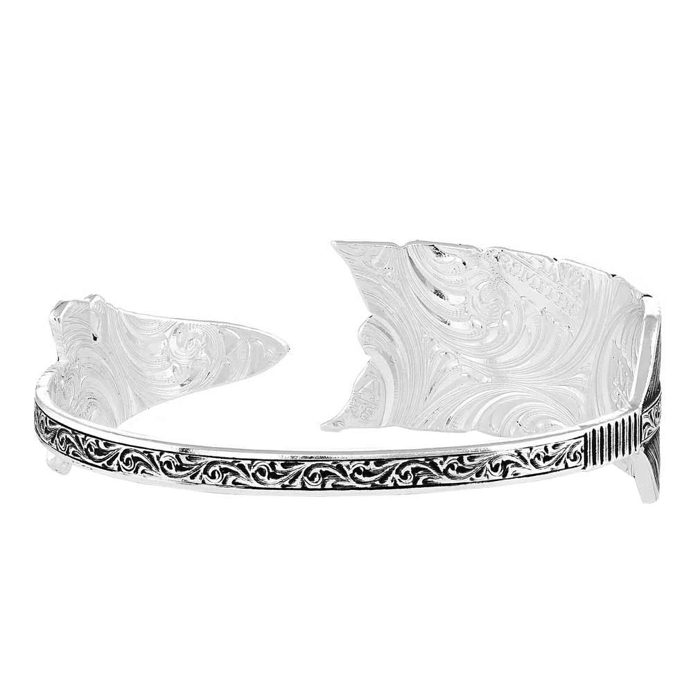 This silver-finished cuff bracelet from Montana Silversmiths holds an arrow with etchings and carvings. One end of the cuff bracelet is the feather while the other finishes with the arrow.