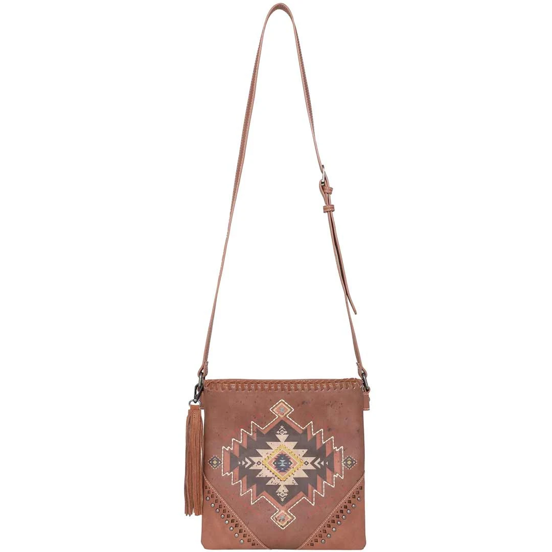 Made of PU leather that has a suede feel, this crossbody features an Aztec print outlined with stitching, whipstitch detail, antique silver rivets and studs accents, accented with detachable tassel charm and has a top zipper closure. There are dual zippered compartments and an open compartment in the center, inside zippered compartments have 2 open pocket and a zippered pocket. There is a zippered pocket and an open pocket on the back and an adjustable crossbody strap.