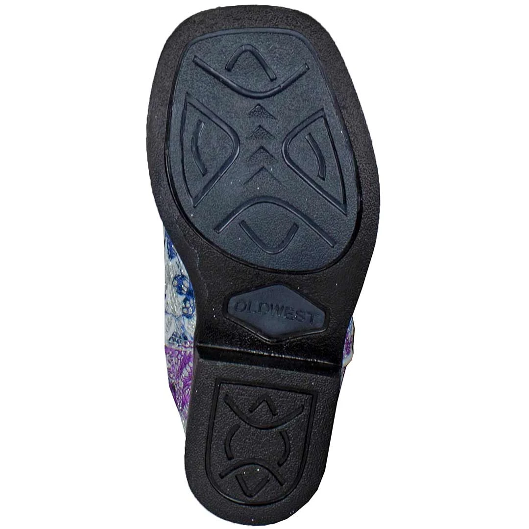 These Old West toddler girls’ floral bling cowgirl boots have a matching floral pattern foot shaft with an all-over glitter accent. They have a broad square toe and flexible outsole.