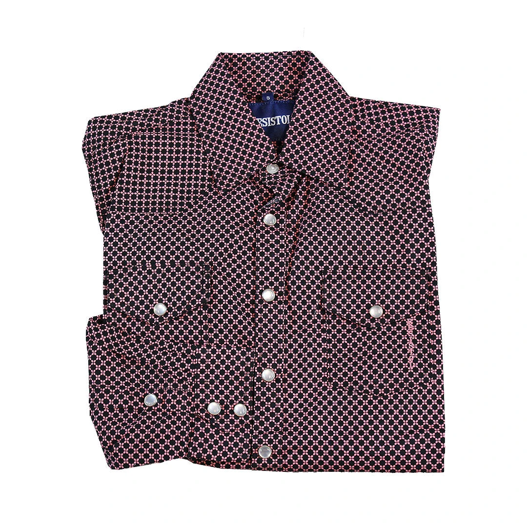 This boy’s western shirt from Resistol is made from 100% cotton and features a charcoal and pink rope diamond print.