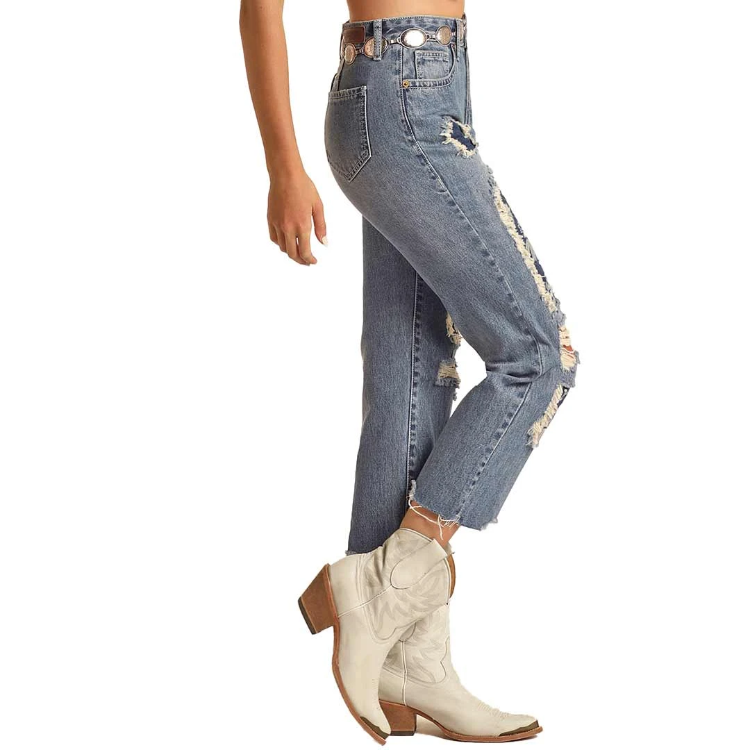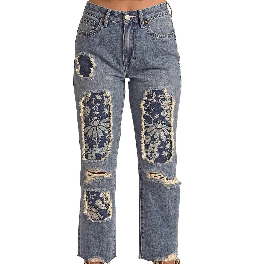 From Rock & Roll Denim, this is a woman’s straight leg jean in a medium vintage wash. It features floral embroidered patches under the supper distressed legs and a cropped length.
