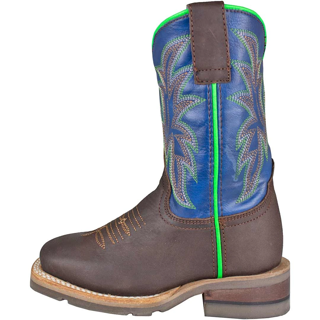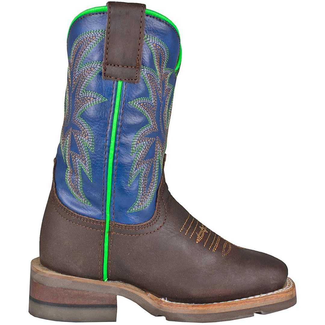 This authentic boy’s Roper cowboy boot features a blue shaft and brown vamp, with 7 row classic stitching and green piping accents.