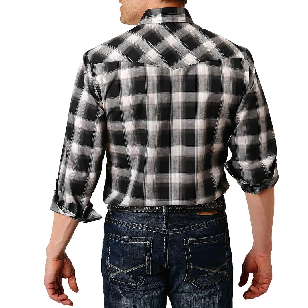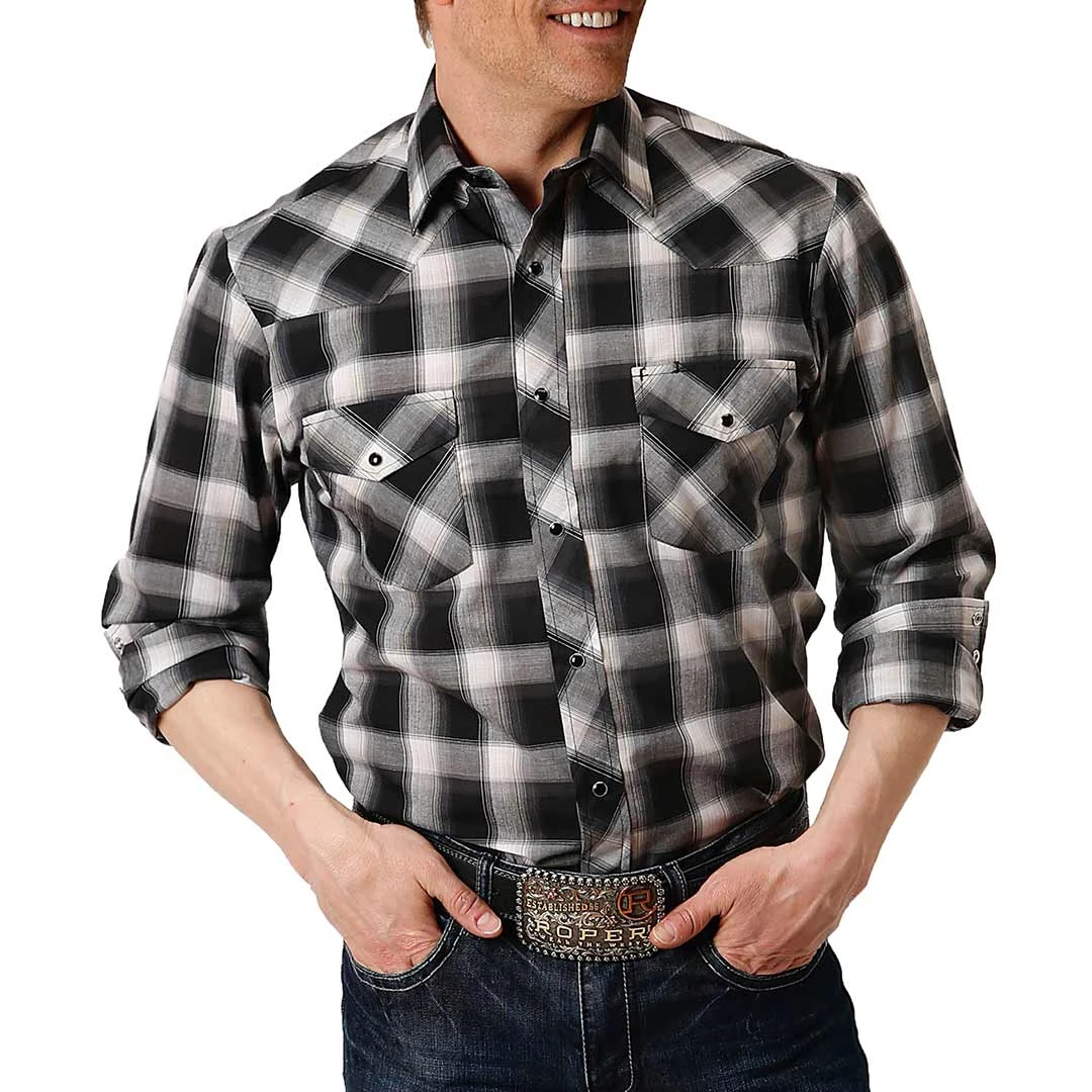 This plaid print men’s shirt from Roper features pointed yokes, two snap flap pockets and snap cuffs. Perfect for the office or a night out.