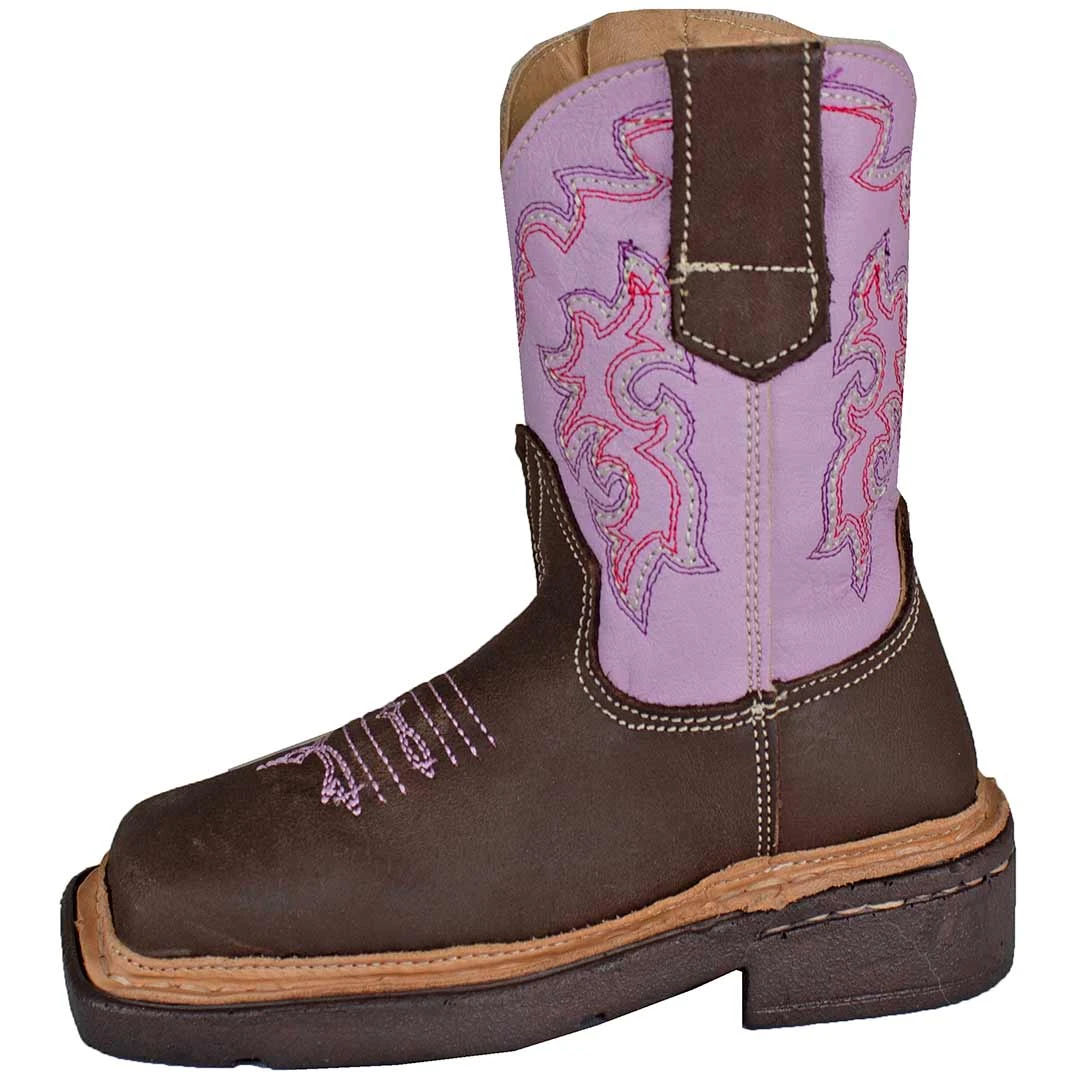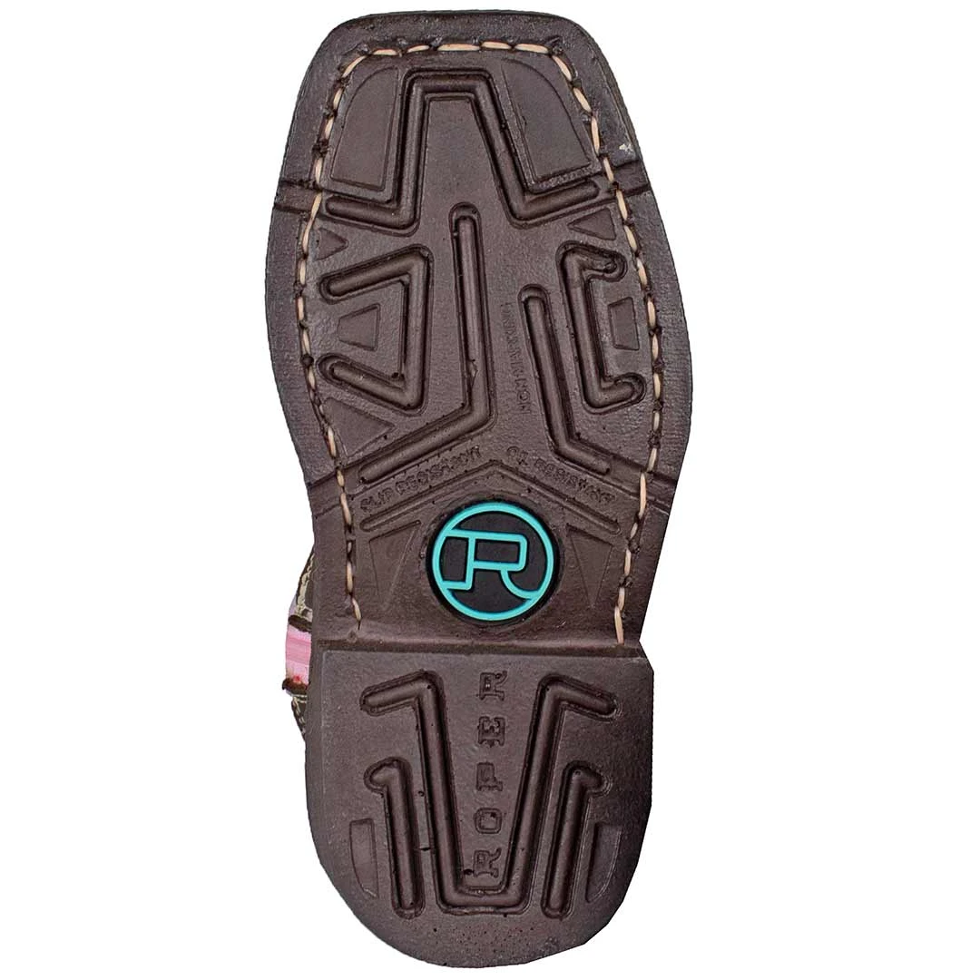 This authentic toddler girls’ Roper cowgirl boot features a pink shaft and brown vamp, with 5 row classic stitching and pink piping accents with a side zipper for easy on and off.