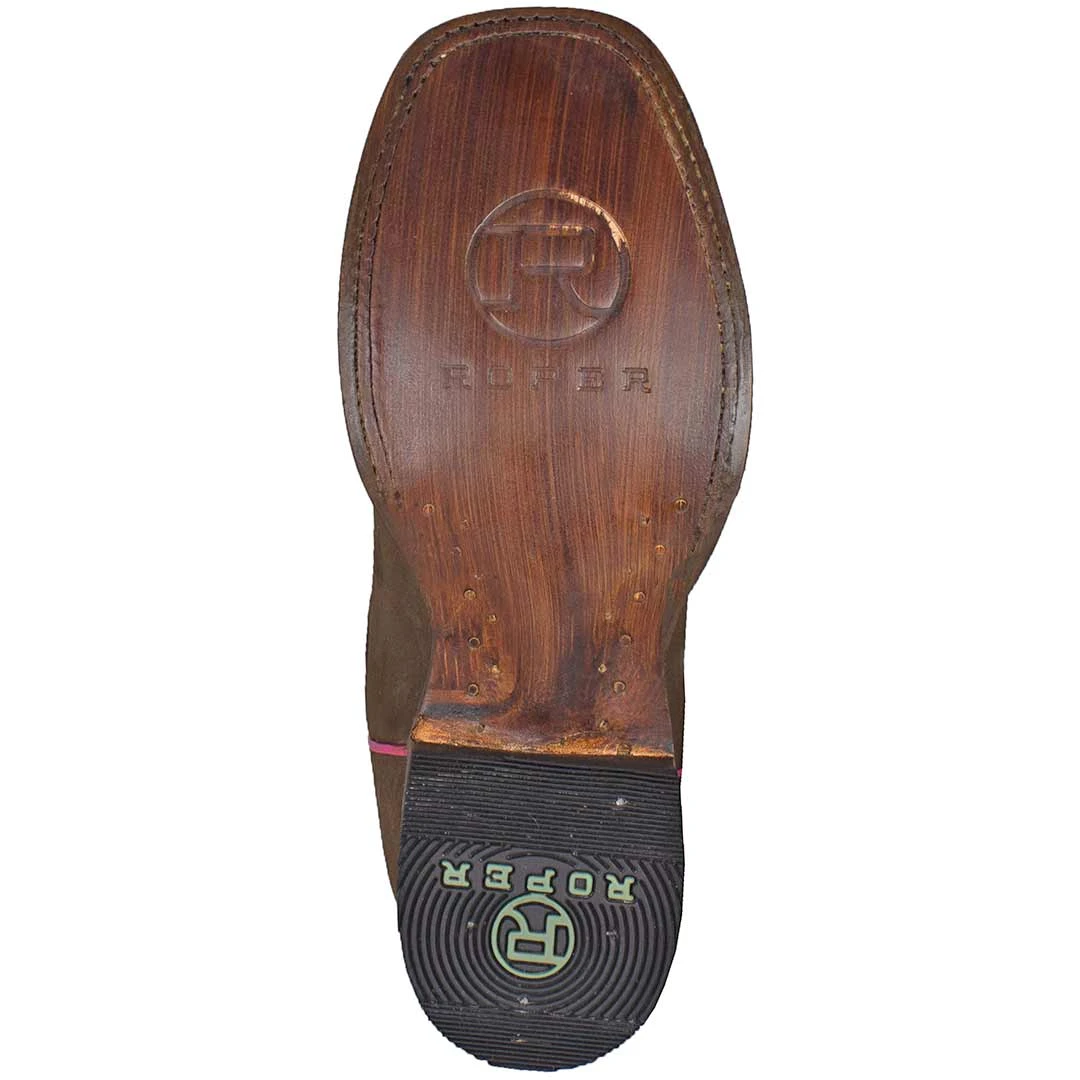 This authentic youth girls’ Roper cowgirl boot features a pink shaft and brown vamp, with 5 row classic stitching and pink piping accents.