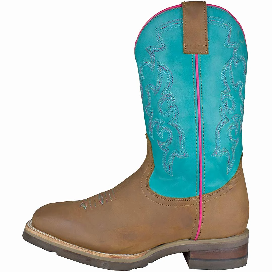 This authentic youth girl’s Roper cowgirl boot features a turquoise shaft and brown vamp, with 5 row classic stitching and pink piping accents.
