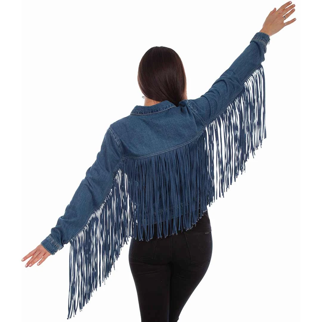 This classic jean jacket from Scully features a new twist with added long fringe across the back and sleeves. It has a button front, two chest flap pockets and two lower vertical side entry pockets.
