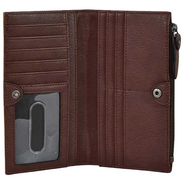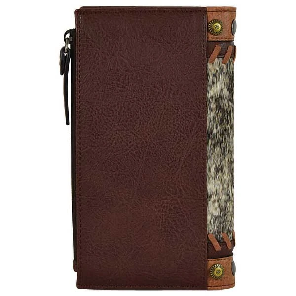 From Tony Lama, this women’s wallet features natural cow hair with stud and whipstitch accents. It has one ID window, 3 bill/receipt pockets, 11 card slots and one zip coin pocket.