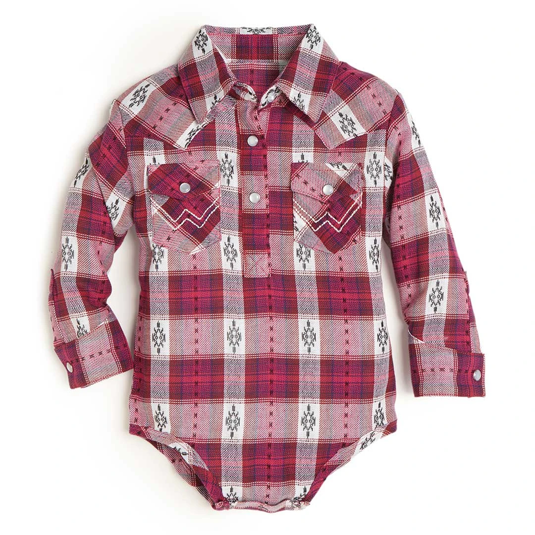 Now, your pint-sized fashionista can perfect the Western-inspired look with this adorable Aztec patterned bodysuit. The Wrangler bodysuit has all the authentic details you know and love in a fun aztec print, including Western yokes and cuffs, two snap flap pockets, a snap seat closure for speedy outfit changes, and a snap placket. This long-sleeved bodysuit is perfect for photoshoots, family gatherings, and more.