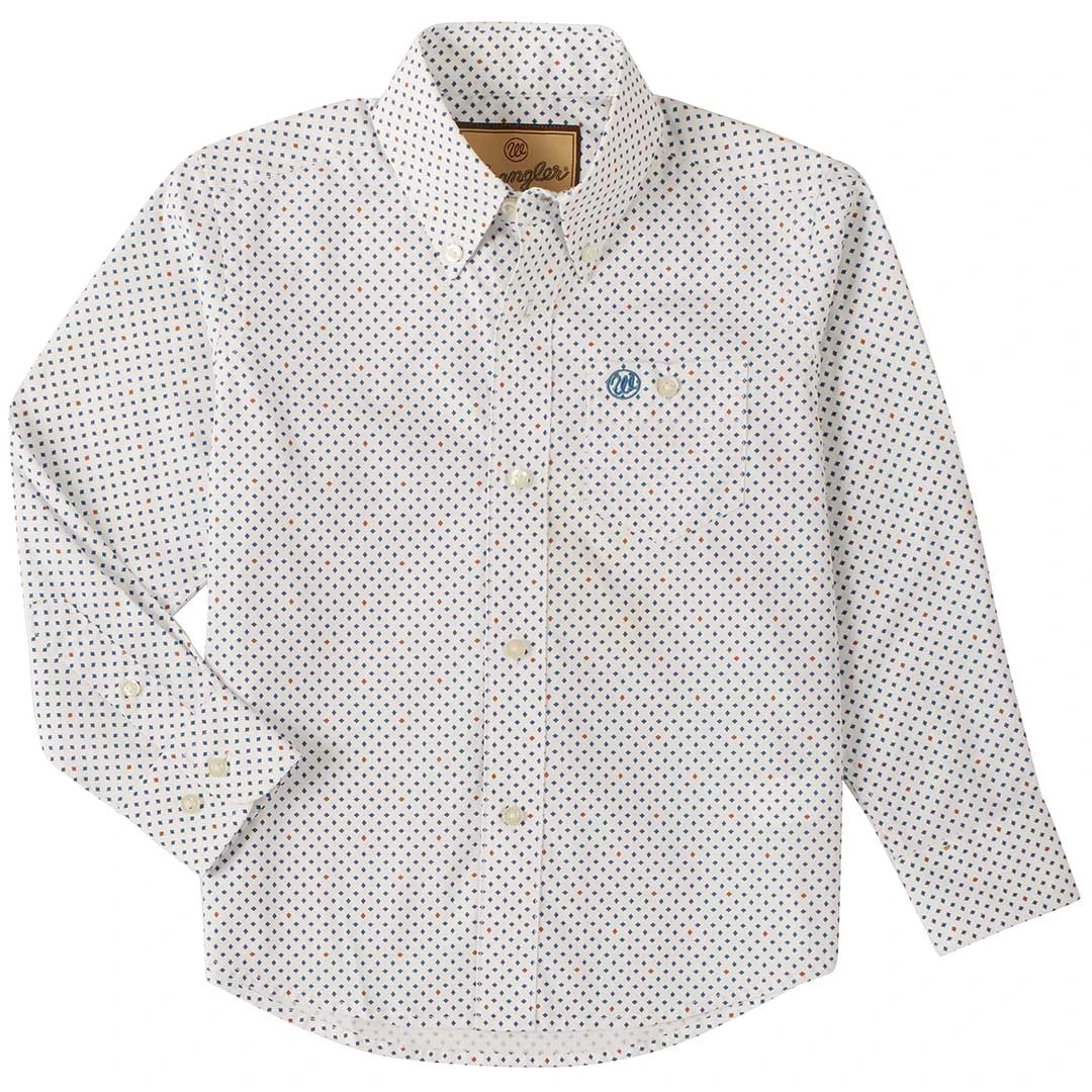 From the Classic collection by Wrangler, this cotton/poly blend will keep the young cowboy warm on cool days, cool on warm days and always looking stylish with the button down collar, straight back yoke with box pleat, finished hem and button closure.